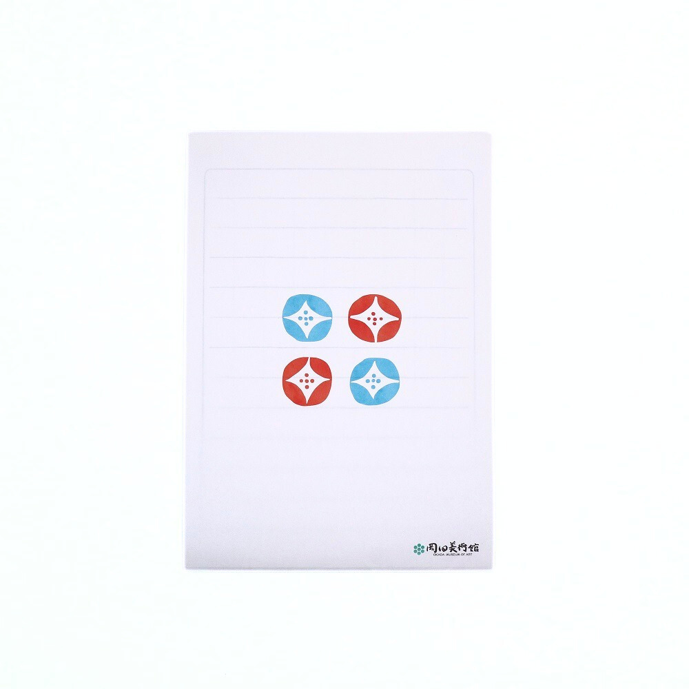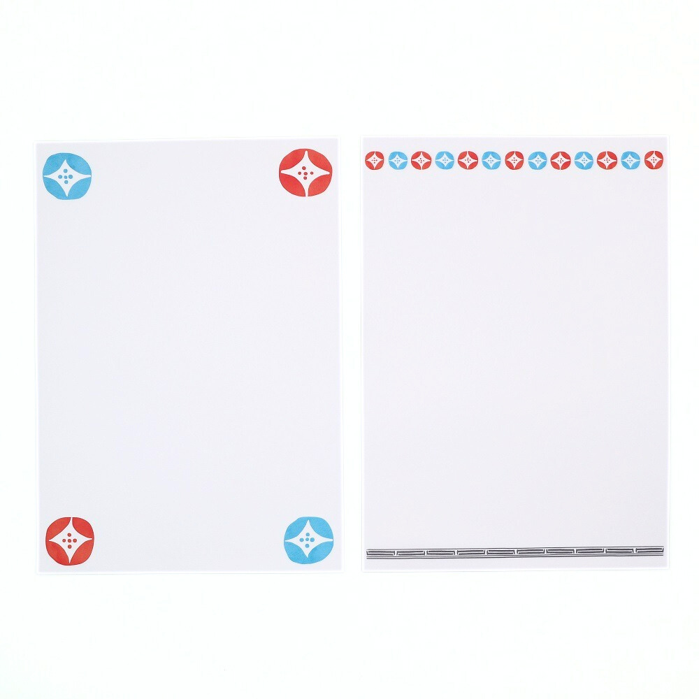 野々村仁清「色絵七宝文細水指」から、赤と水色のカラフルな七宝模様を便箋と封筒にしました。2種類のデザインの便箋が各6枚入った使いやすいB5サイズ。紙の名産地“愛媛”から生まれた便箋のための和紙を使っており、書きやすさが特徴です。 サイズ 便箋 : 2柄 各6枚 計12枚入、B5 封筒 : 1柄 5枚入、90×187mm 罫線台紙 : 1枚入、B5
