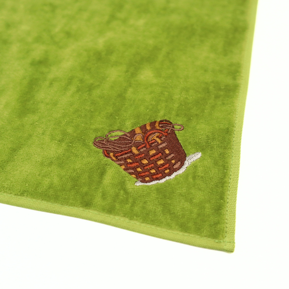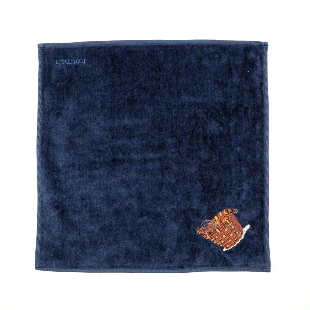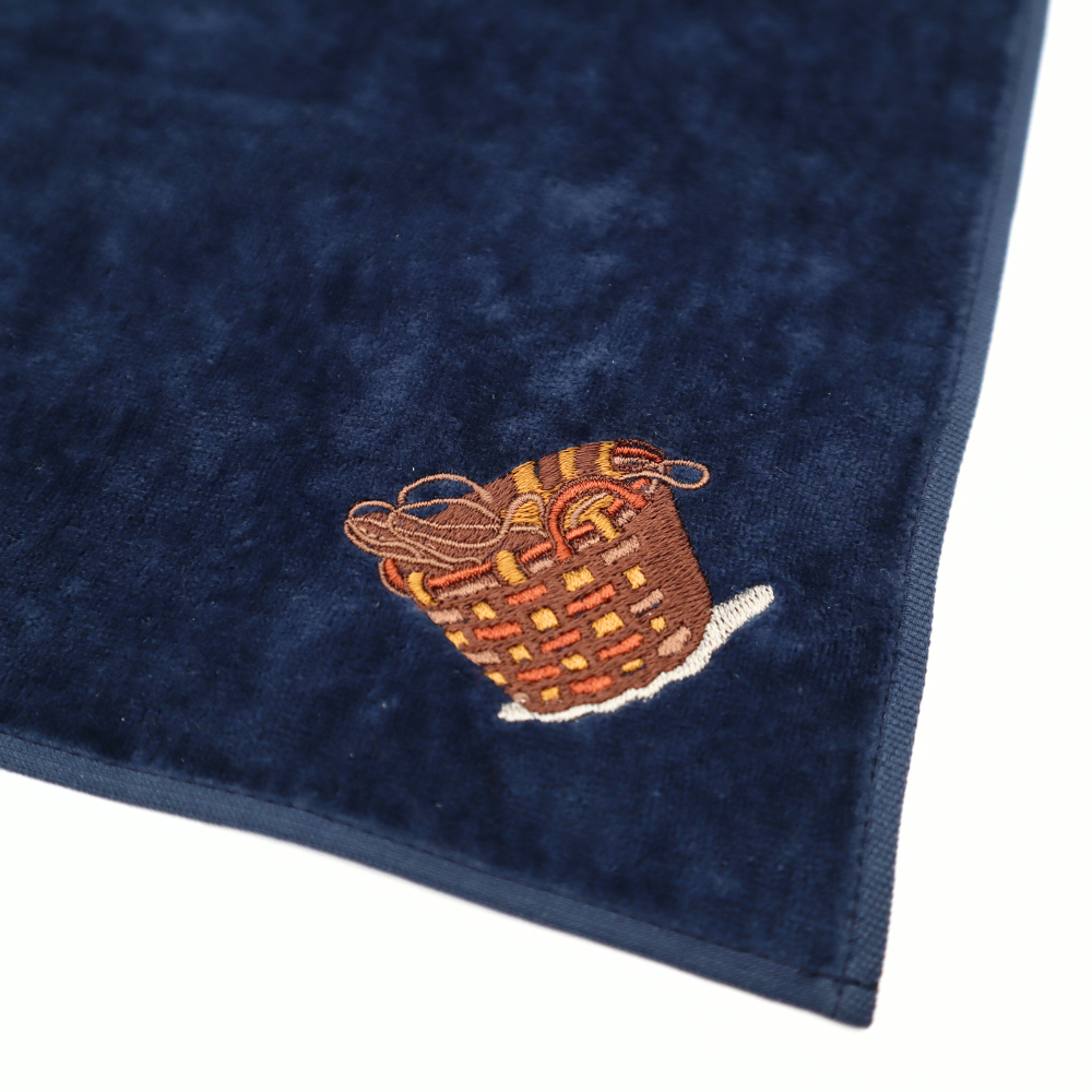 近代の日本洋画に本格的な「写実」表現をもたらした鹿子木孟郎(かのこぎ・たけしろう、1874~1941)の《ノルマンディーの浜》(泉屋博古館東京寄託)に描かれた印象的な「籠(かご)」を、肌触りの良いベロアハンカチに刺しゅうしました。秋冬シーズンにあわせて色味もシックに仕上げています。展覧会の記念の一枚としても、日常使いにもぴったりな一枚です。