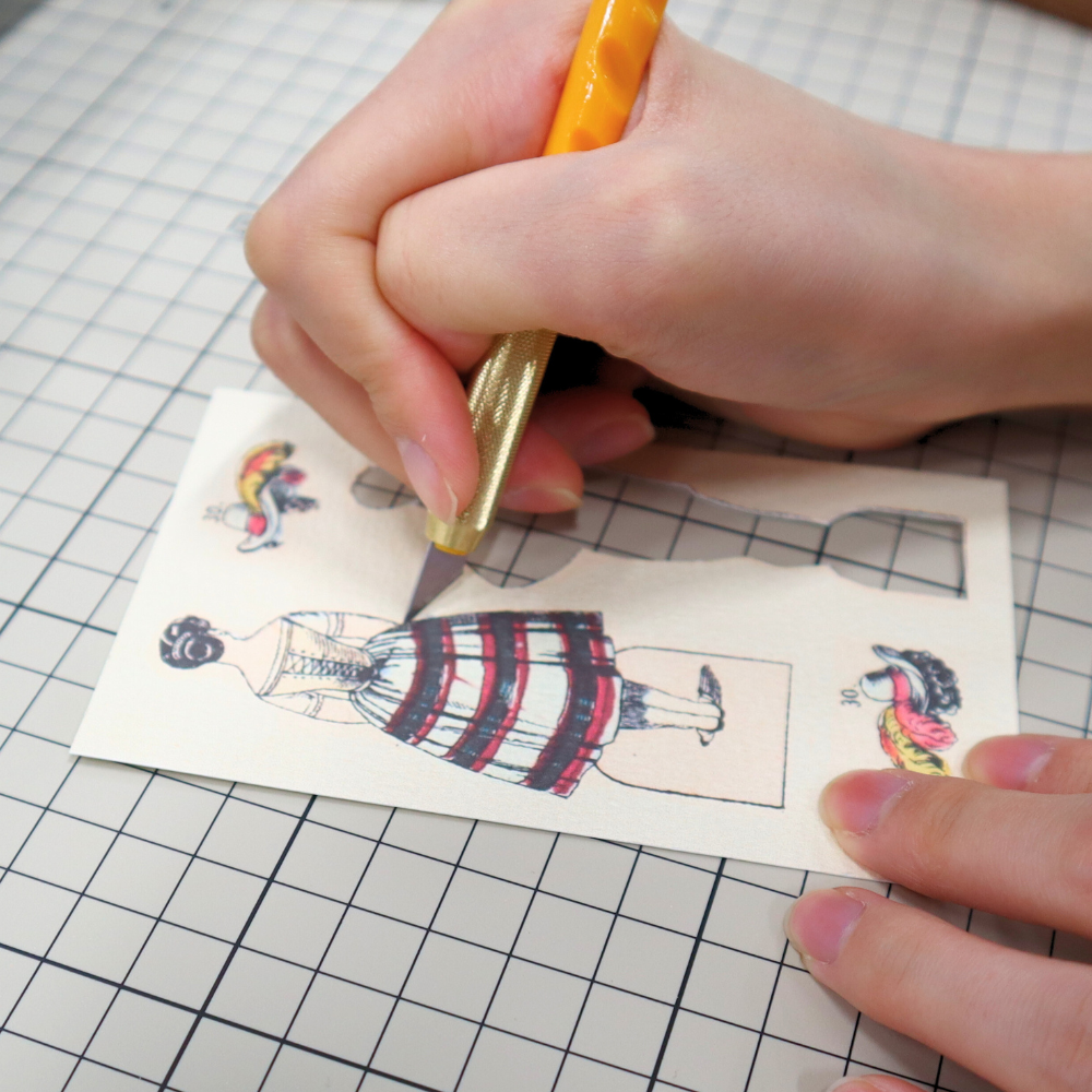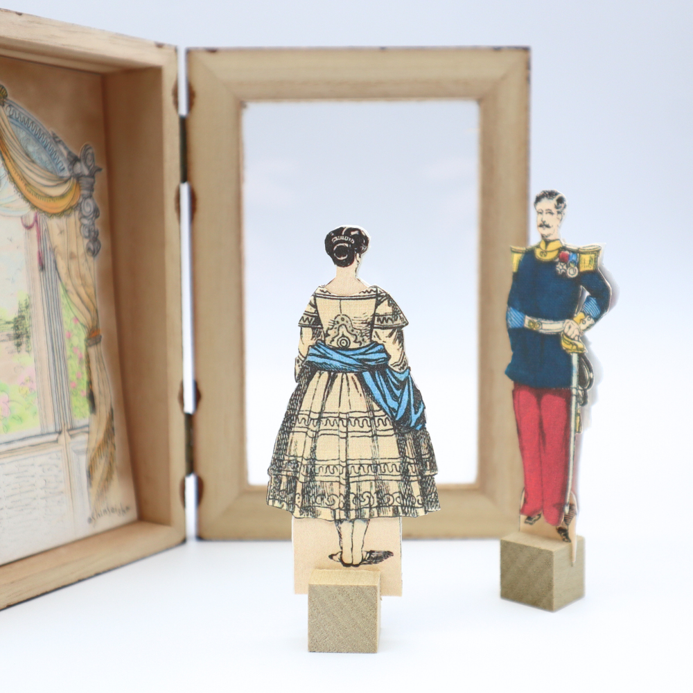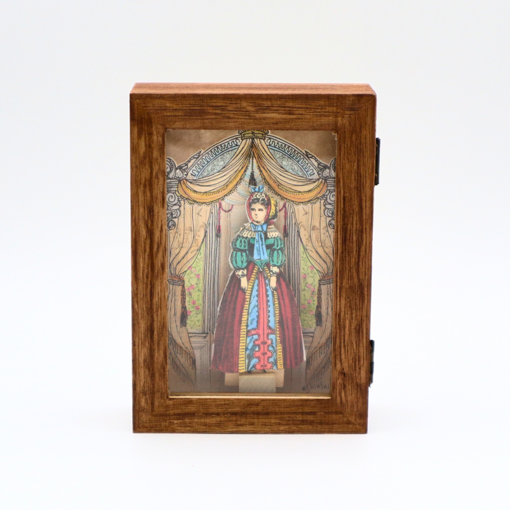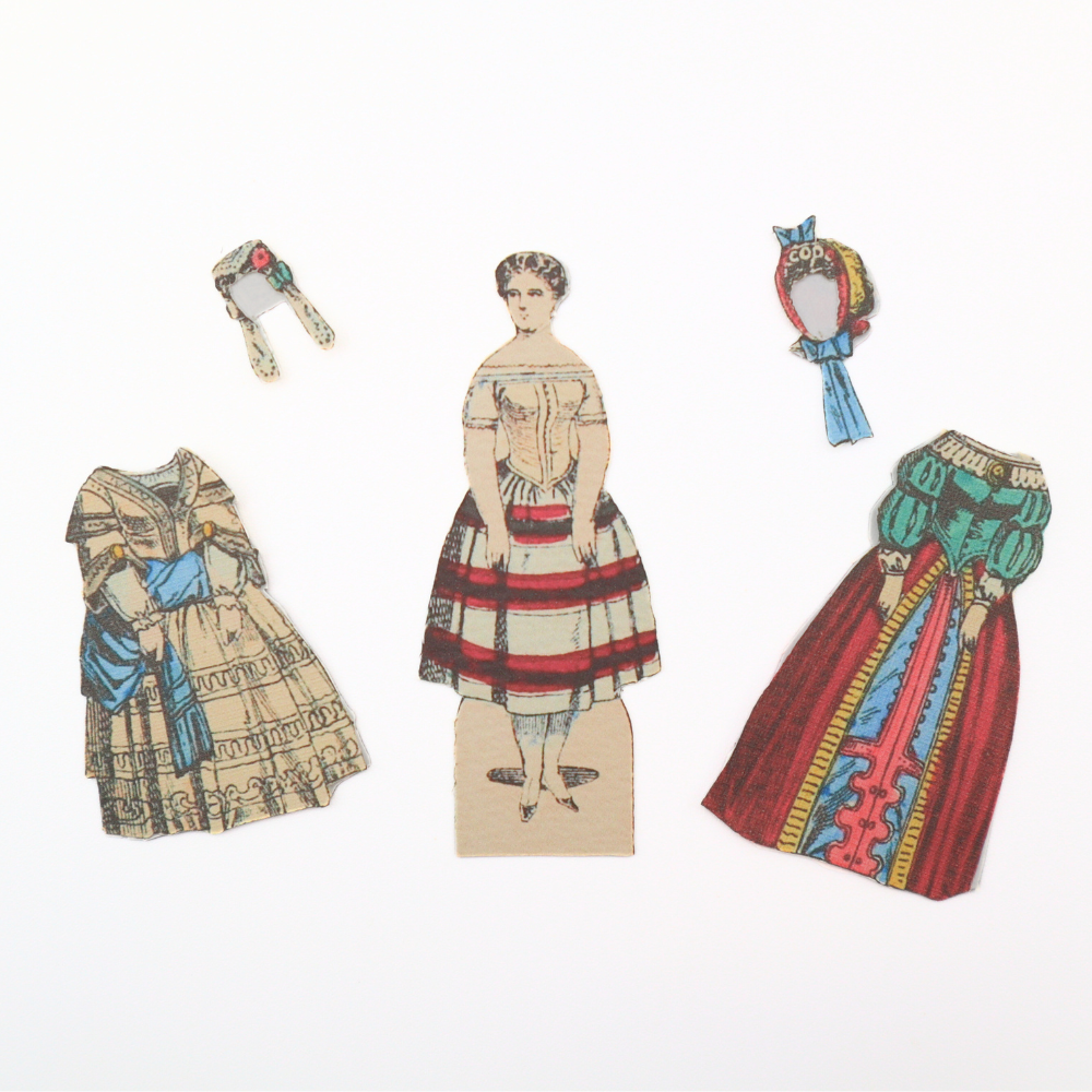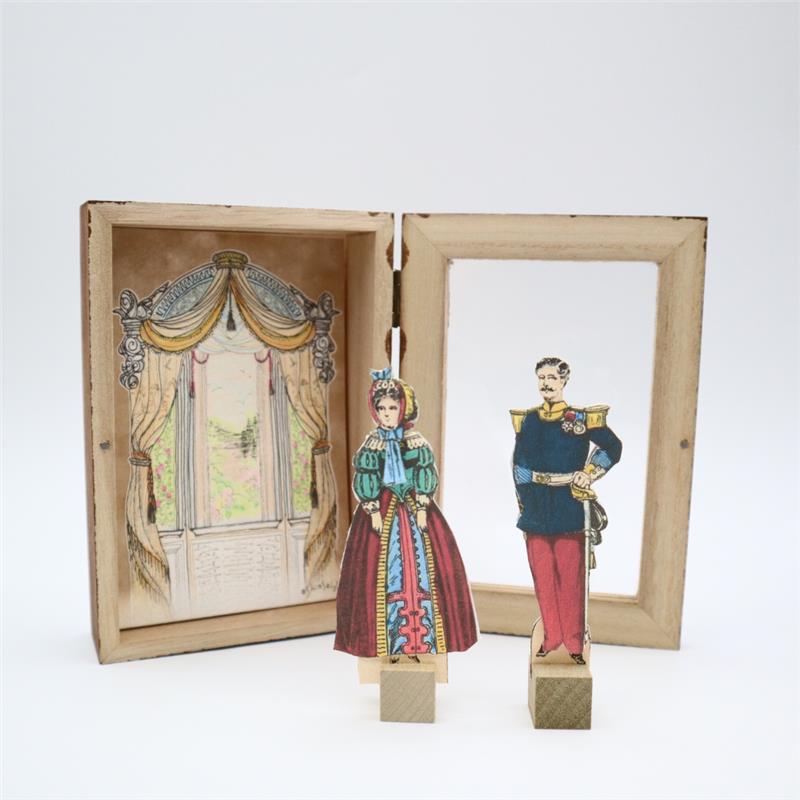 ベルラン社の着せ替え人形を元に製作。 木製飾り窓付きBOXに納めました。 17着分の服とカツラできせかえを楽しんでください。 遊び方の説明書付き。 サイズ 14cm×9.5cm×3.5cm(窓付きBOX) 素材 着せ替え人形 : 紙 窓付きBOX : 木