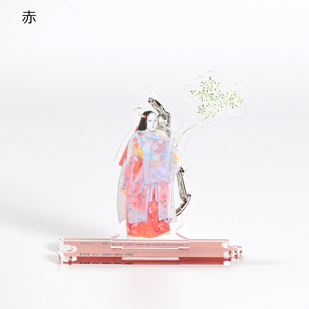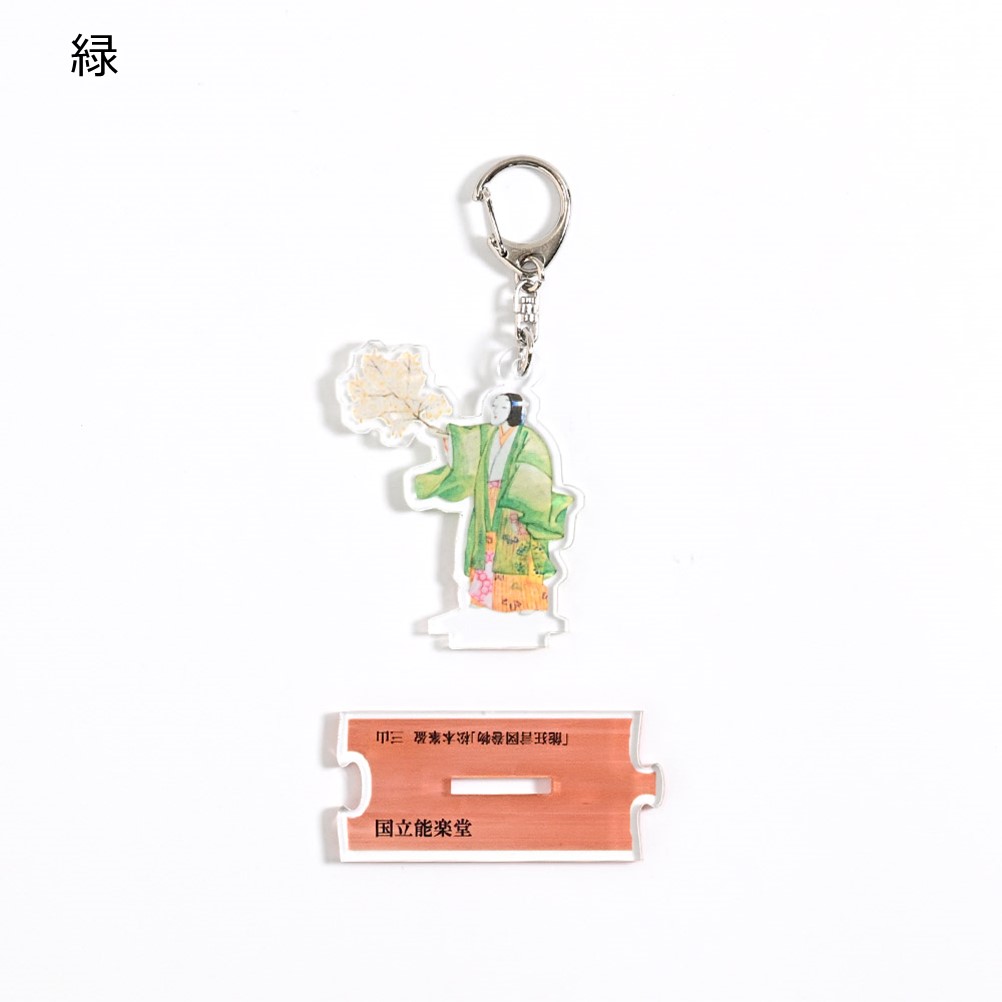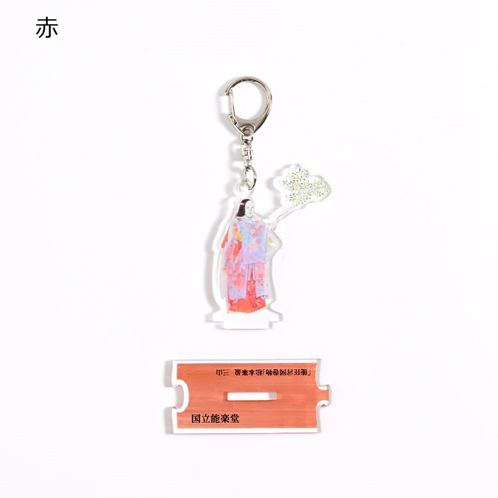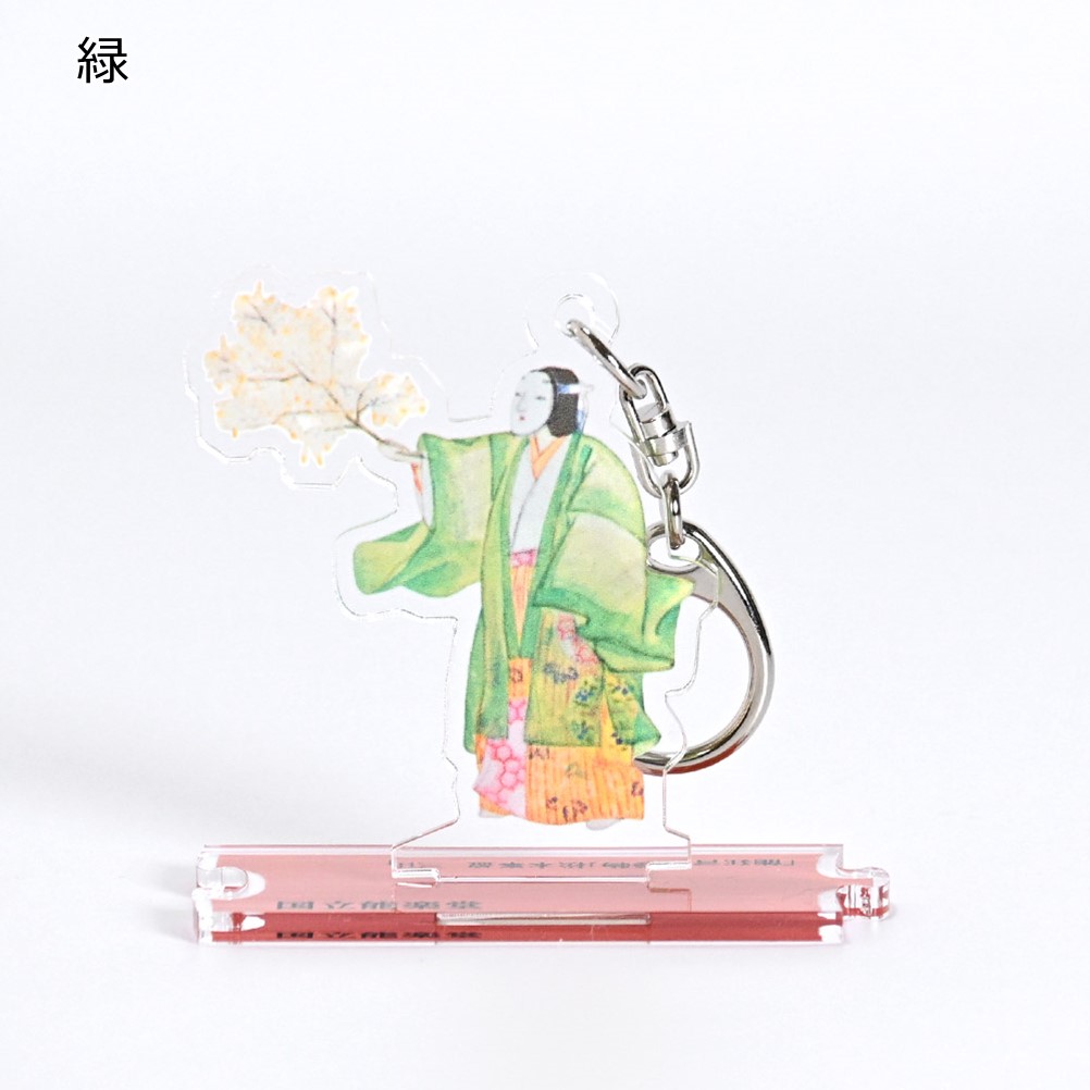 世界初 ! ? 能絵アクリルスタンドキーホルダーです。2種の台座を繋げていざ勝負。台座は国立能楽堂の能舞台です。 【赤 : 三山A】三山の後シテ、桂子さん 【緑 : 三山B】三山のツレ、桜子さん サイズ 65×60mm 素材 アクリル