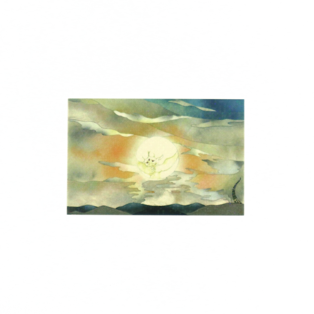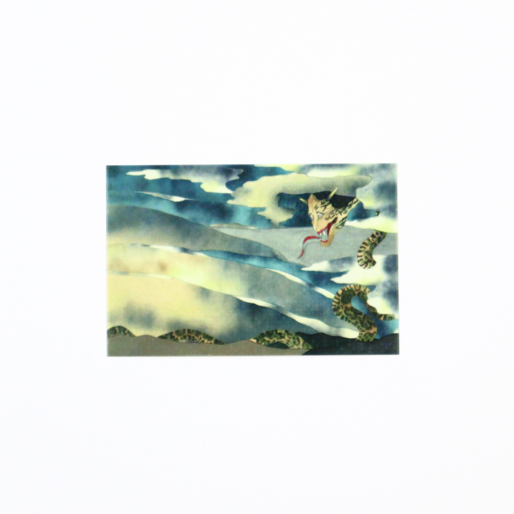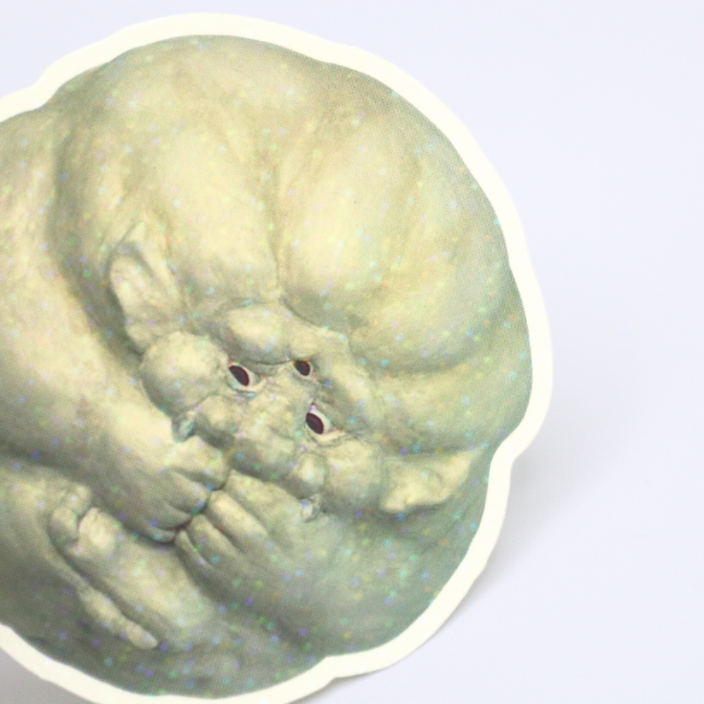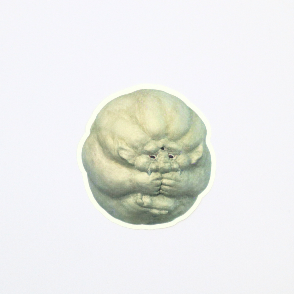 「うしろのしょうめん」展は、作家・なからいみきさんがさまざまな「こわいもの」をモチーフとして作り上げるお財布「マメポ®」を中心とした展示企画です。今回の企画のために制作された大きなレザーアートや、作家が作り出した妖怪・霞渦眼(かごめ)の立体造形も展示されていて、それらをオリジナルステッカーにしました。いずれもスマホケースに入れて持ち歩けるサイズです。