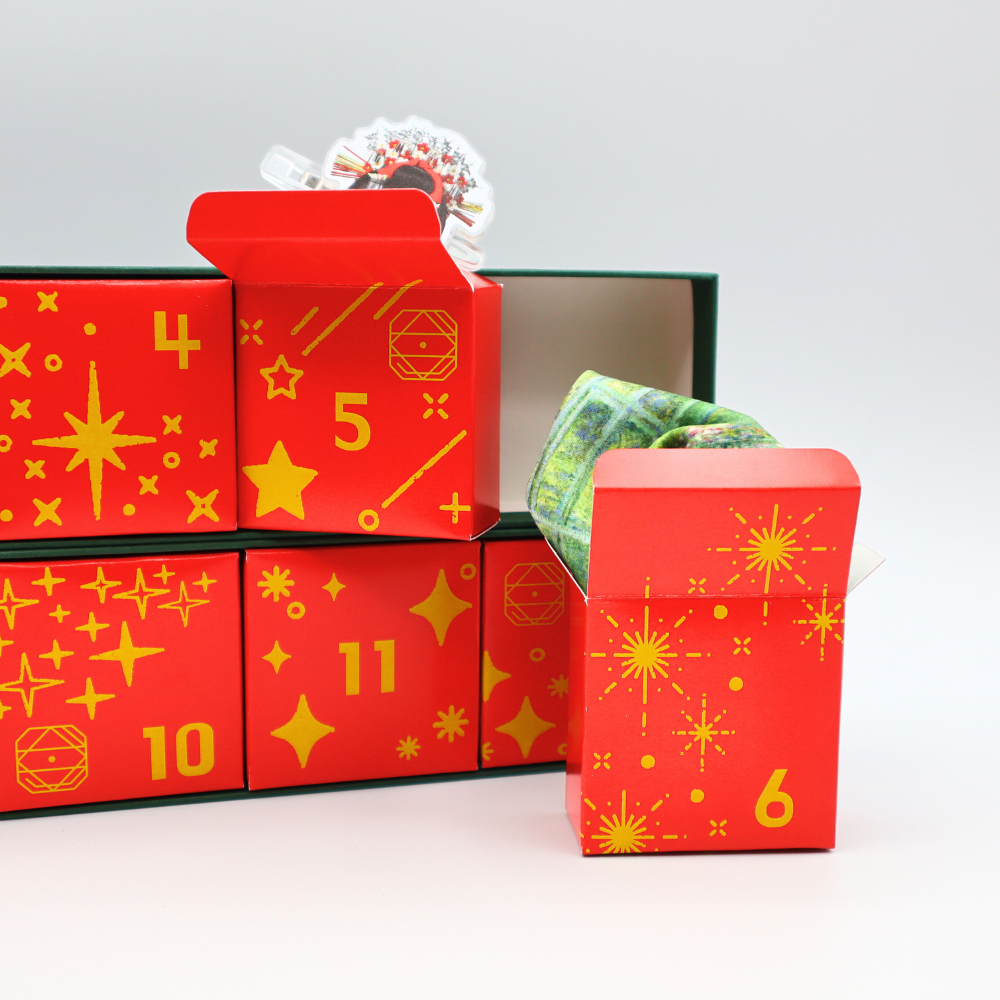 12個の箱に全国の美術館や博物館の所蔵作品やマスコットキャラクターをモチーフにしたグッズが1つずつ入っています。クリスマスやお正月まで1日ひとつずつ開けてカウントダウンしたり、1か月にひとつずつ開けて1年かけて楽しんだりなど自分のとっておきのタイミングで、オリジナルグッズをお楽しみいただける商品です。