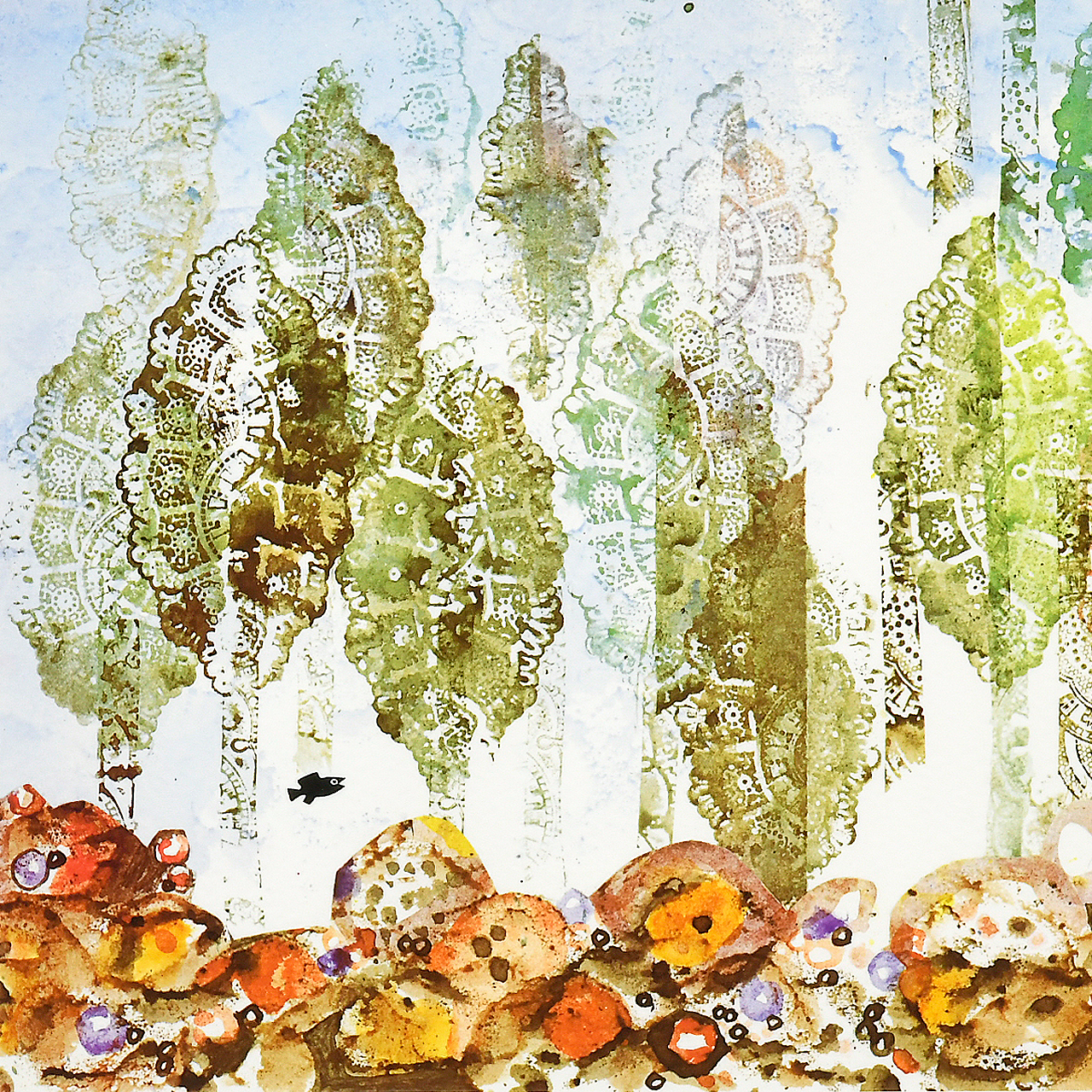 リトグラフやエッチングなど古典的版画技法に最新デジタル技術を融合し、コンピュータで画像処理したデータを元に顔料系特殊インクを霧(ミスト)のように吹き付けて印刷することにより、幅広い階調によるオリジナルに迫る再現性を実現した技術です。品質実験では、通常室内光下30年は退色しないというデータが出ています。