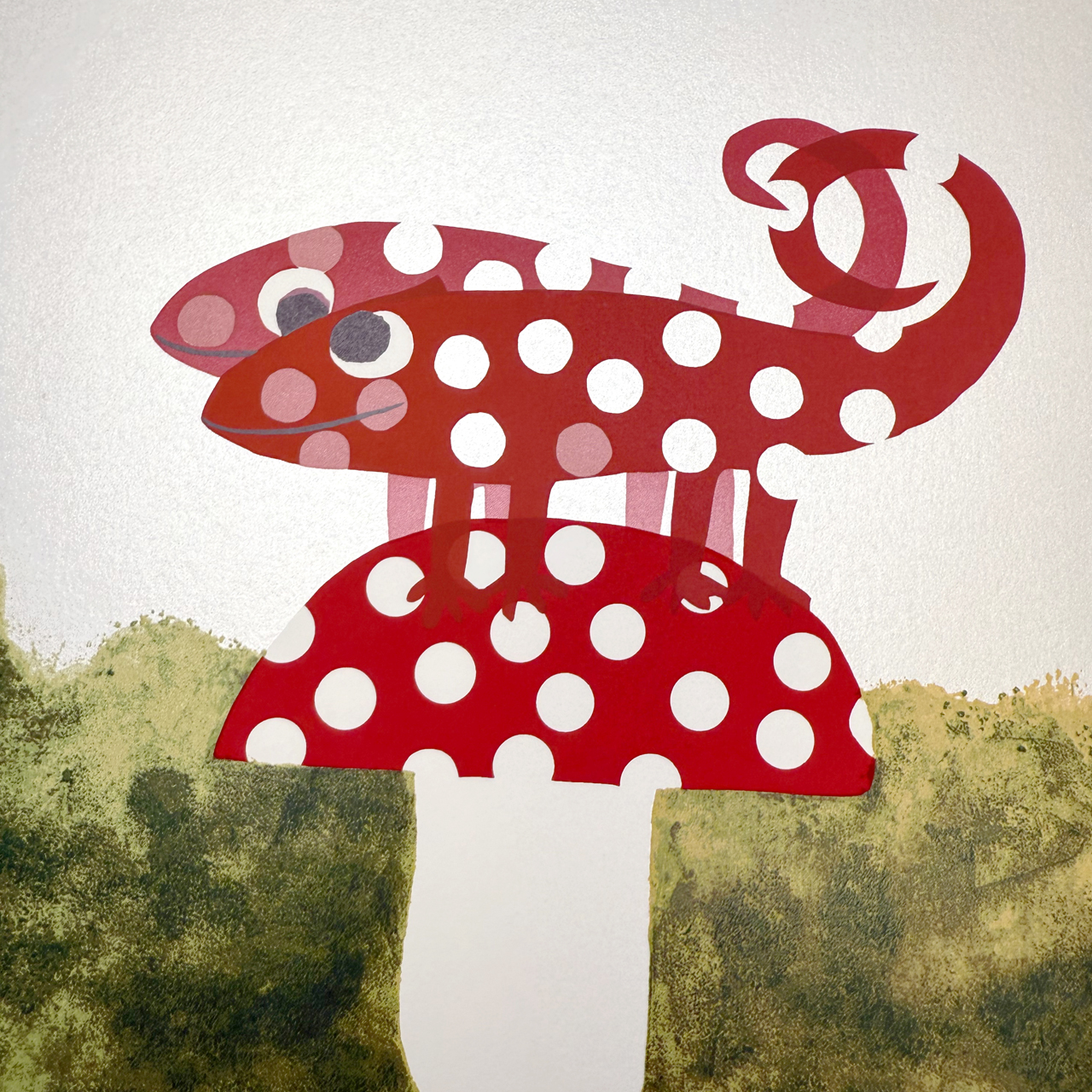 悩み続ける一匹のカメレオンが最後に答えを見つけ出し、幸せそうに佇む姿の作品です。赤い水玉もようはポップでやさしく、見ているだけで楽しい気持ちになります。