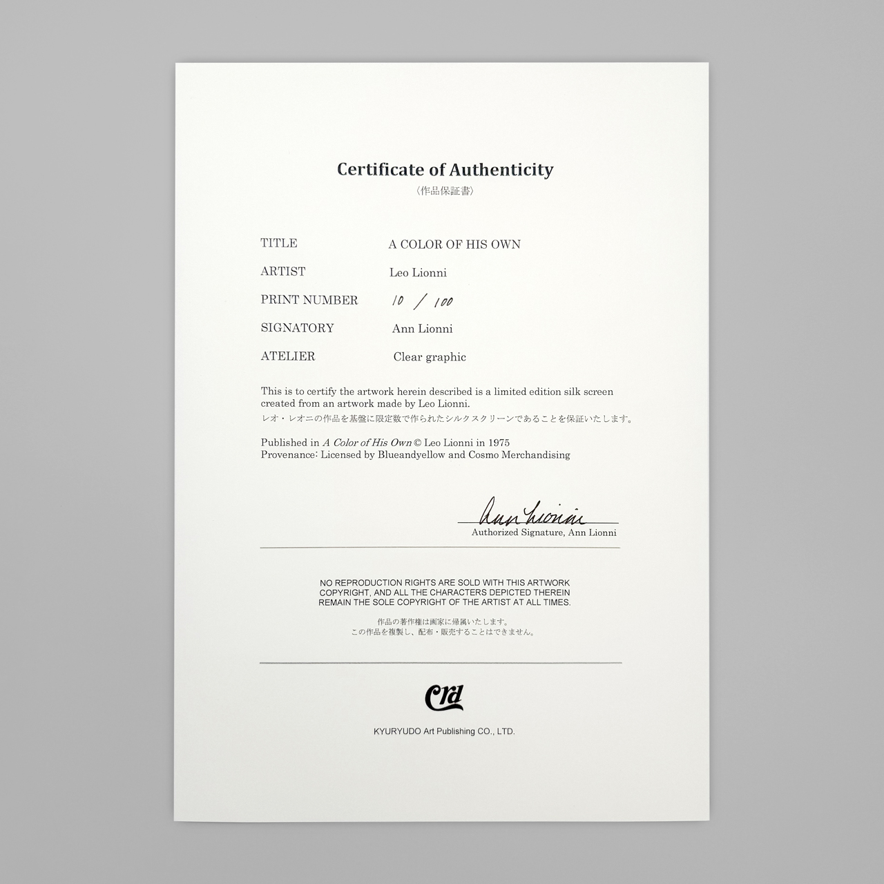 お孫さんであるアニー・レオニ氏の直筆サイン入り保証書がついています。