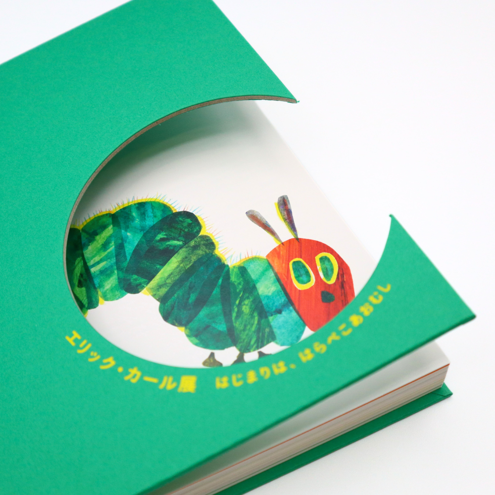 表紙がくりぬかれ、あおむしが顔をのぞかせる、遊び心あふれる装丁も魅力の一冊です。